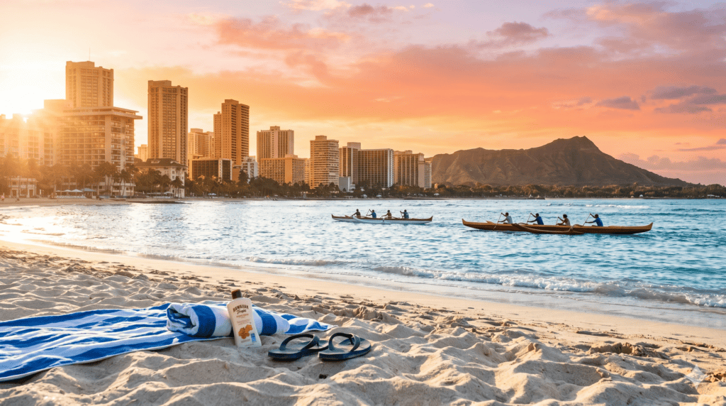 Photorealistic travel editorial photograph of Waikiki Beach, Oahu, Hawaii at golden hour. Wide-angle 16:9 landscape composition. Foreground shows warm white sand with a few folded beach towels and a pair of reef-safe sunscreen bottles. Midground features calm turquoise ocean with two outrigger canoes gliding across the surface and gentle surf breaking near shore. Background shows the iconic Waikiki resort skyline in soft warm light with Diamond Head crater visible to the right under a glowing orange-pink sky. No identifiable faces, no text, no logos. Soft lens flare from low sun at frame left. Colors: warm golds, turquoise water, creamy white sand. Style: National Geographic travel photography, sharp foreground detail, slightly dreamy background bokeh.
