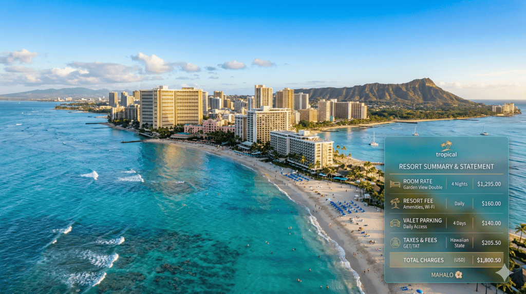 Rates are approximate and fluctuate seasonally. Always verify the current resort fee and parking total directly with the hotel before booking. Hawaii’s stacked taxes (~18.7% on Oahu) apply to both room rates and resort fees.