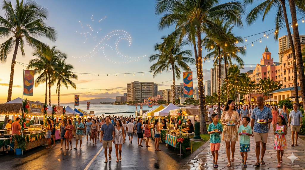 Picture this: it’s a warm April evening in Waikiki, the sun is melting into the Pacific, and Kalakaua Avenue — the main drag that runs along one of the most famous beaches in the world — has been completely taken over by the smell of sizzling SPAM musubi, the sound of live Hawaiian music, and thousands of happy people milling about under the glow of string lights and stage spotlights. Then, at 9 p.m., the sky above the beach explodes in a choreographed drone light show.