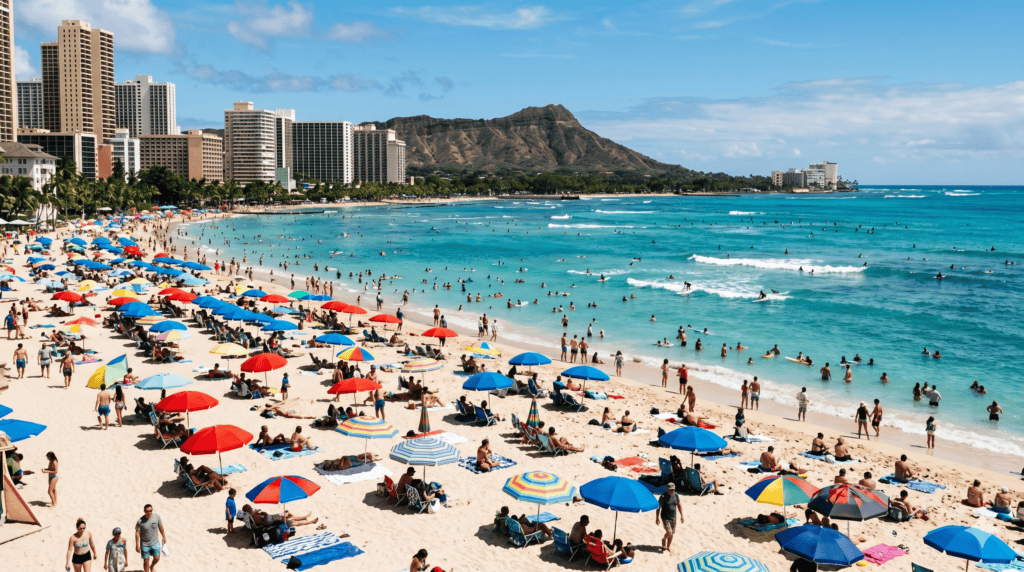 - Waikiki Beach and Kuhio Beach — packed from mid-morning until late afternoon most days in peak season