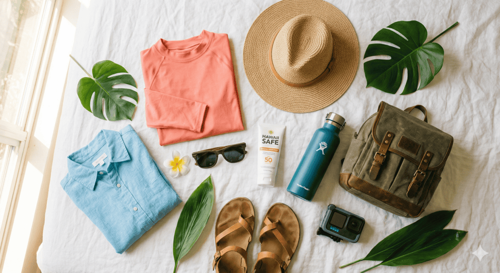 - Toiletries and health: Daily essentials (buy them before you go—Hawaii pricing runs high), aloe vera, blister pads, pain reliever, allergy and motion sickness meds